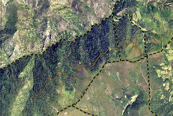 En línea continua de color amarillo se representa el mapa de la repoblación y en línea discontinua se representa los límites del monte Oballo nº 16.387 y la zona de Rocabo registrada en la escritura del Rouquiecho.